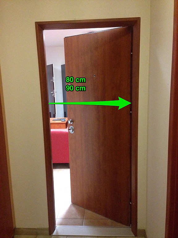 Ptáte se, jak správně změřit dveře? Vchodové dveře mají nejčastěji šířku 80 nebo 90 centimetrů. Abyste rozměry vchodových dveří určili správně, je potřeba měřit zárubeň, od které se šířka dveří odvozuje. Rozměr se přitom neměří od konce zárubně, ale v jejím vnitřku – jde tedy o šířku zárubně v tom nejužším místě. Pokud si nejste jistí, kde přesně šířku měřit, poradí vám následující fotografie.